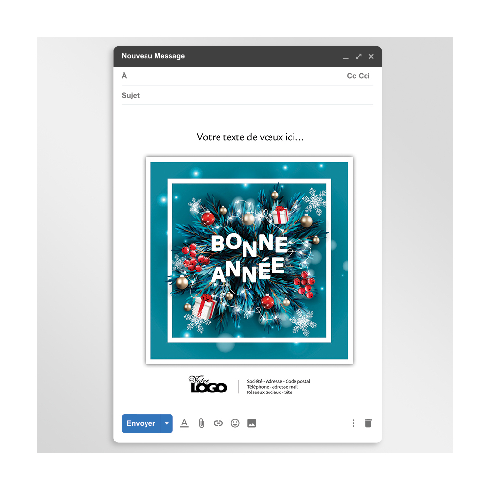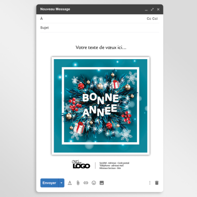 Une fois la création validée, elle vous est transmise par e-mail, directement intégrée au corps du message, prête à être transférée à vos contacts. Votre carte de vœux électronique est ainsi immédiatement exploitable, sans limitation d’envoi, et compatible avec l’ensemble des systèmes de messagerie.